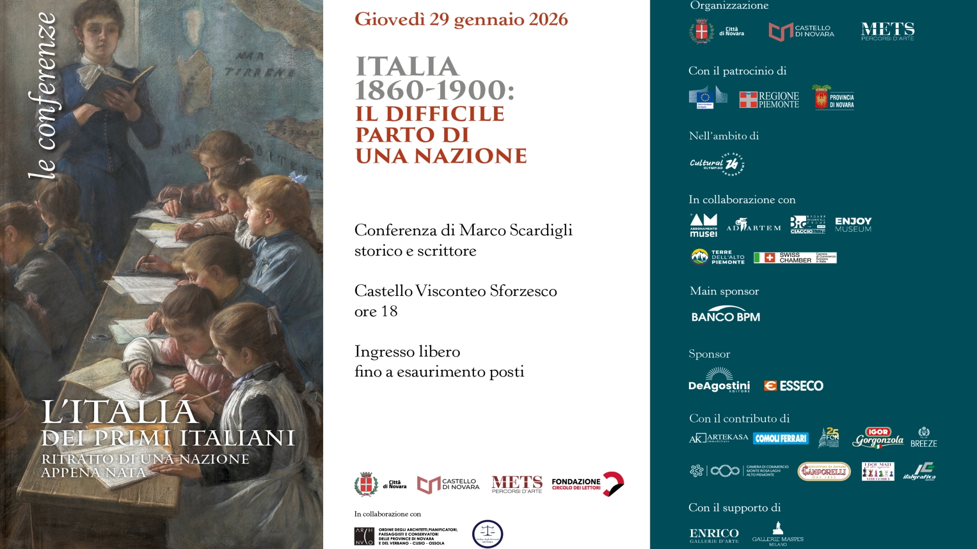 Sei incontri ideati a corredo della mostra L’Italia dei primi italiani. Ritratto di una nazione appena nata, organizzata da Comune di Novara, Fondazione Castello, METS Percorsi d’arte e Fondazione Circolo dei lettori di Novara in collaborazione con Ordine degli Architetti, Pianificatori, Paesaggisti e Conservatori delle Province di Novara e del VCO e Ordine degli Avvocati di Novara