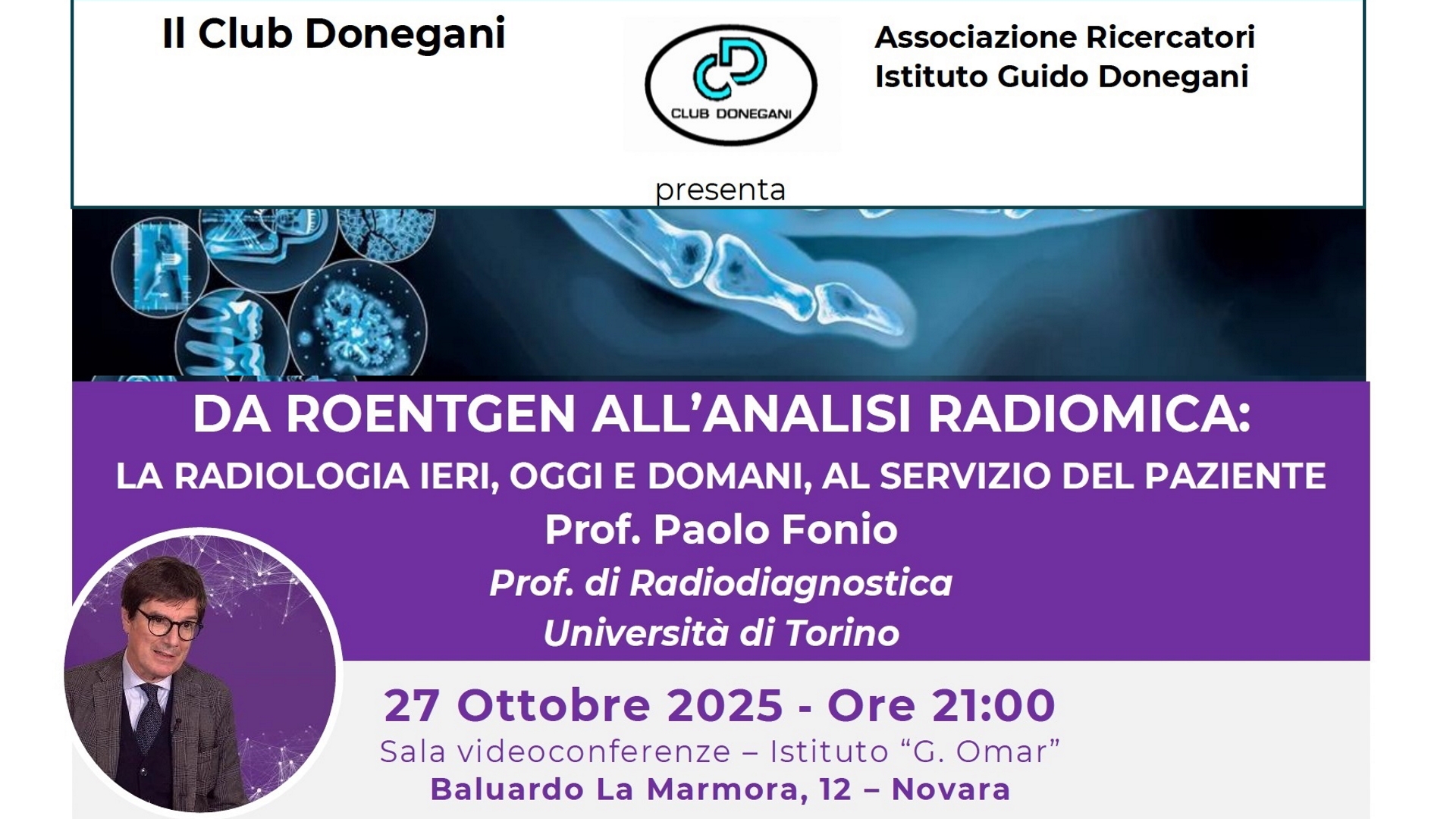 Lunedì 27 Ottobre, alle ore 21, presso l’Aula Magna dell’Istituto G. Omar in Baluardo La Marmora n. 12, il Club Donegani presenta una conferenza dal titolo “Da Roentgen all’analisi radiomica: la radiologia ieri, oggi e domani, al servizio del paziente“
