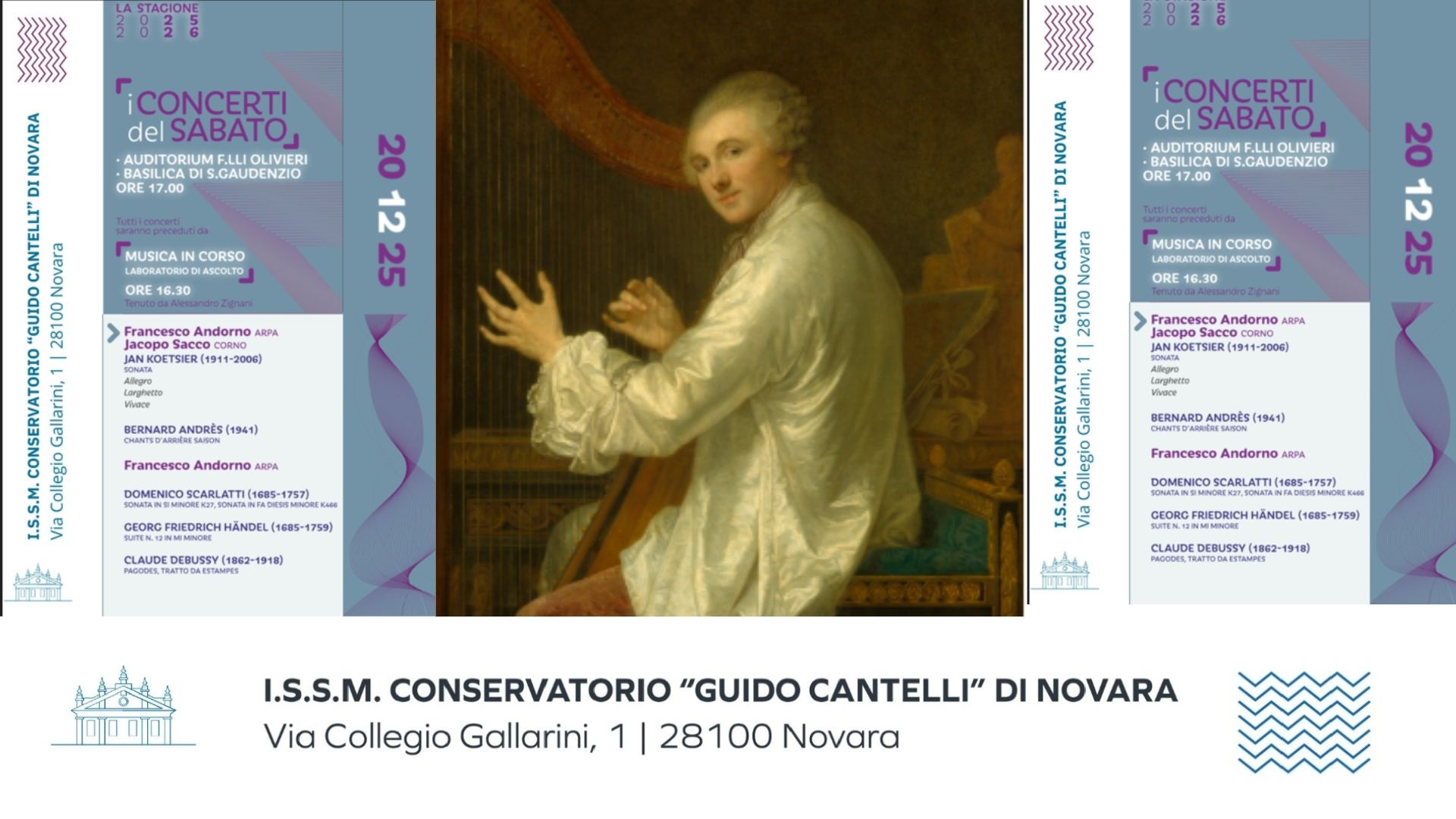 Arpa sola invece per la seconda parte: Andorno suonerà due Sonate di Domenico Scarlatti, la Suite n. 12 di Händel e Pagodes (da Estampes) di Debussy.