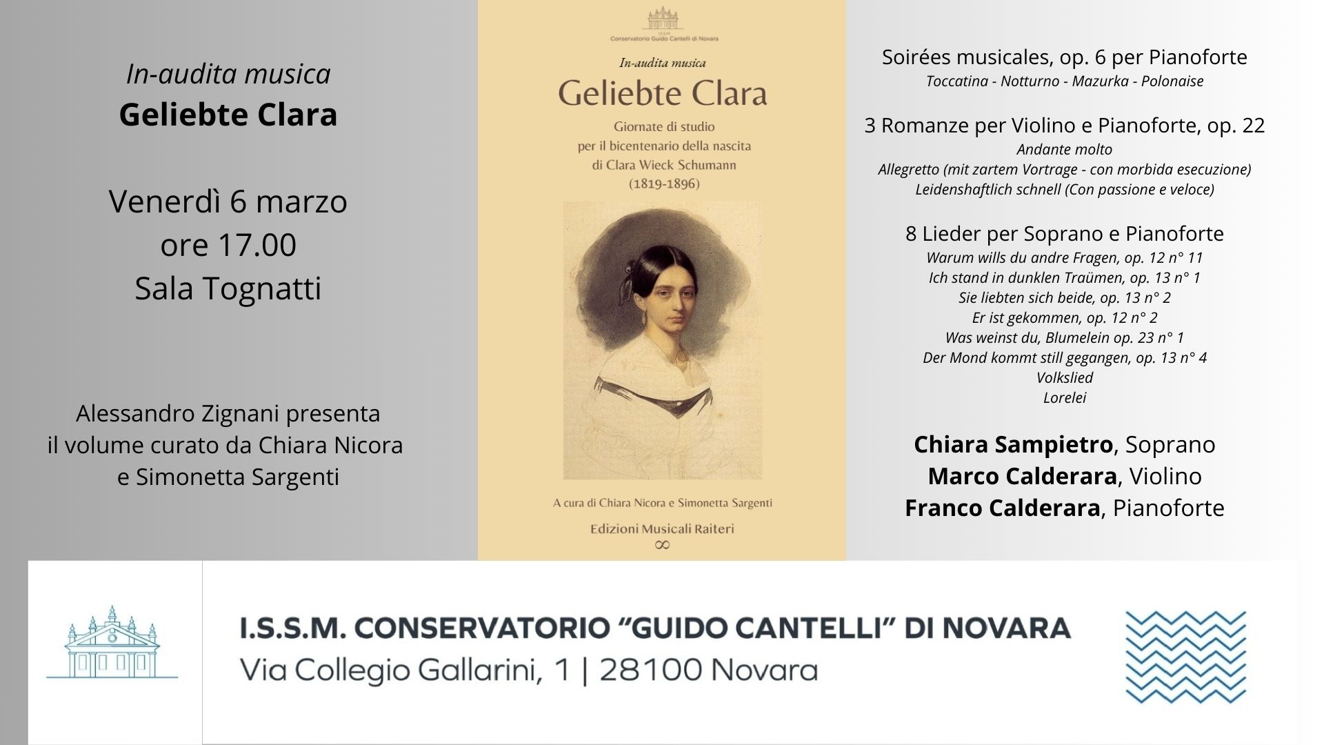Musica e ricerca per questo importante appuntamento di In-audita musica incentrato sulla figura di Clara Schumann in occasione della Festa della donna: il concerto, interpretato da Chiara Sampietro (soprano), Marco Calderara (violino) e Franco Calderara (pianoforte), sarà accompagnato dalla presentazione di Alessandro Zignani del volume, fresco di stampa per l’editore Raiteri, sulla compositrice a cura di Chiara Nicora e Simonetta Sargenti.