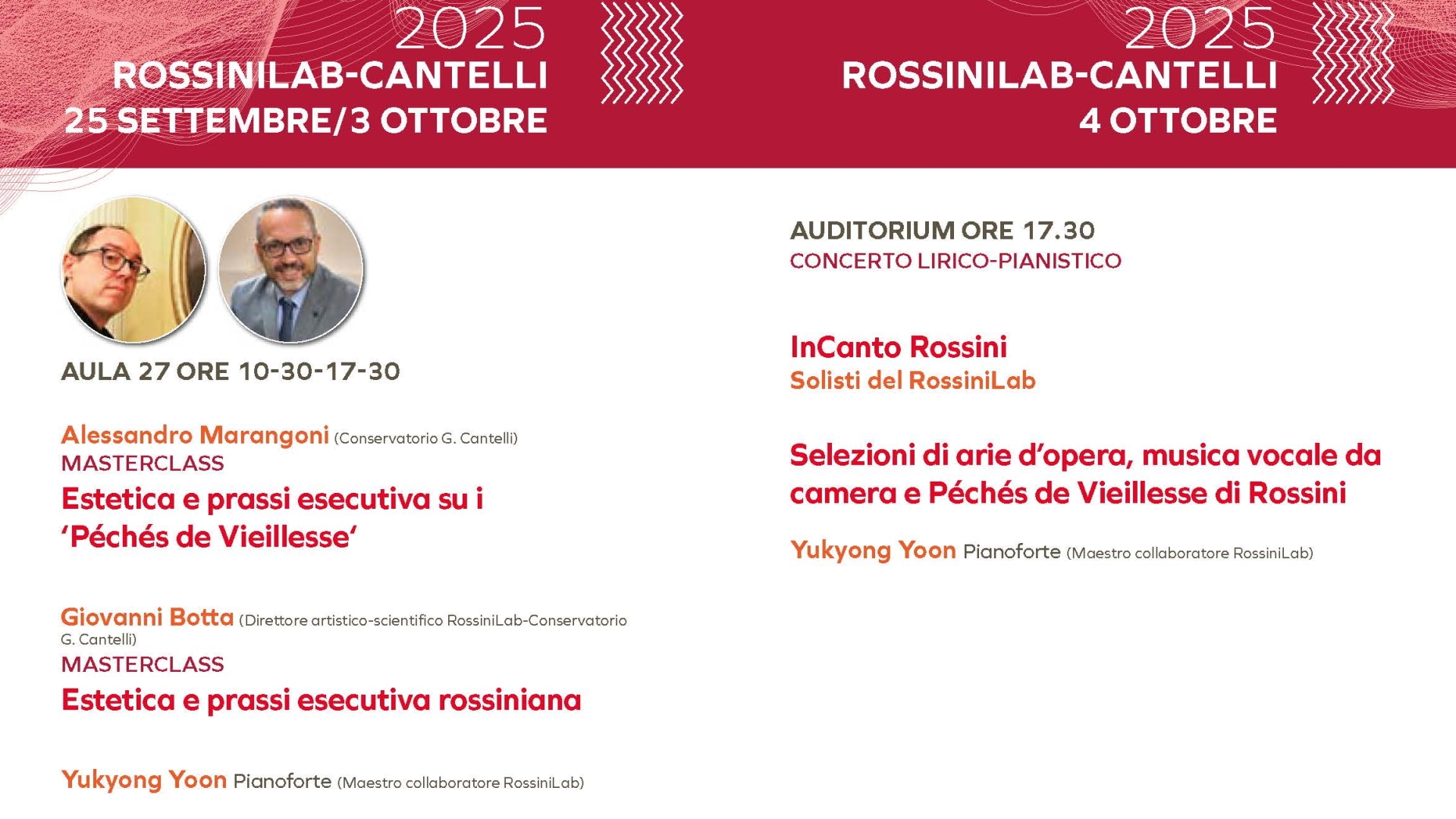Alessandro Marangoni e Giovanni Botta, docenti al Cantelli, il secondo direttore artistico del Rossino Lab, si soffermeranno nelle loro masterclass sull’Estetica e prassi esecutiva su i Péchés de vieilless (Marangoni) e sull’Estetica e prassi esecutiva rossiniana (Botta), coadiuvati da Yukyong Yoon al pianoforte