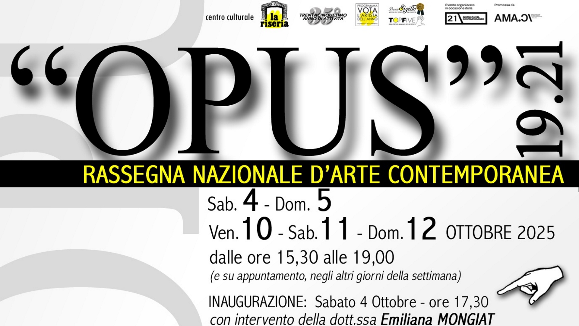 Giunta alla sua diciannovesima edizione e promossa in adesione alla “GIORNATA DEL CONTEMPORANEO” la grande rassegna d’arte “OPUS” propone una nutrita compagine di eccellenti artisti (una cinquantina con più di ottanta lavori in esposizione) che ben rappresentano indirizzi, correnti e tematiche dell’arte contemporanea proposta dal nostro vivace territorio artistico.