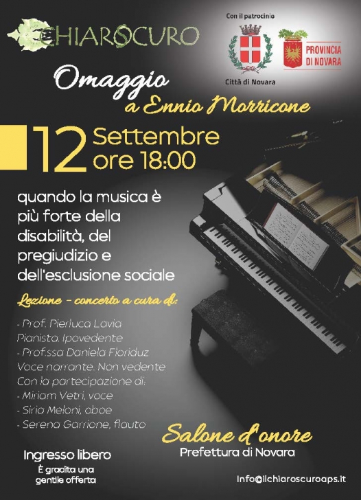 Venerdì 12 Settembre alle ore 18.00, presso il Salone d’onore della Prefettura di Novara, si terrà una lezione-concerto dal titolo “Omaggio a ennio Morricone” che vedra’ esibirsi due non vedenti, soci dell’Associazione di promozione sociale Chiaroscuro: Daniela Floriduz e Pierluca Lavia accompagnati da due giovanissime e talentuose ragazze Miriam Vetri e Siria Meloni.