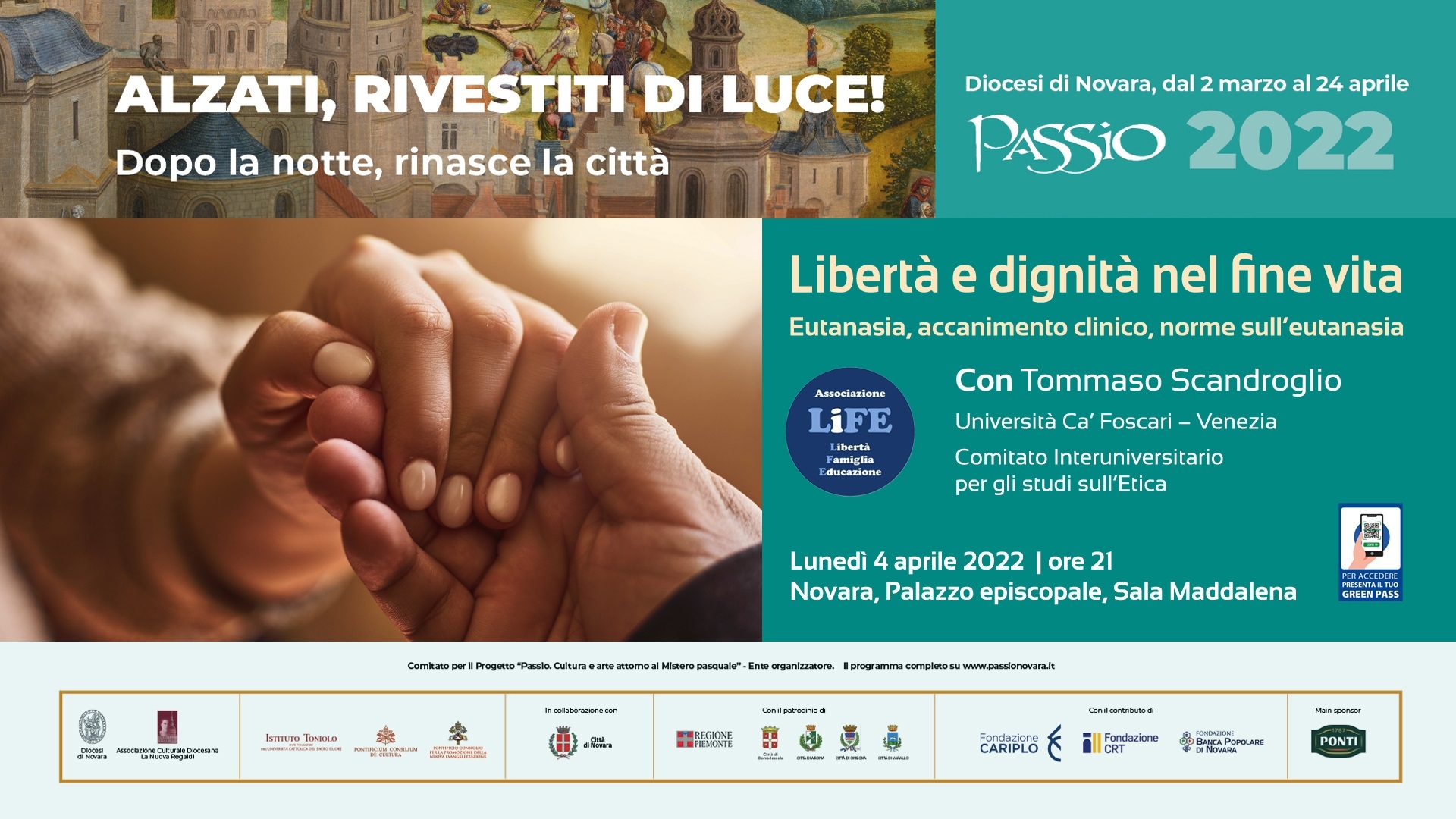 Il fine vita, tra libertà e dignità. È un tema di scottante attualità quello di cui si parla lunedì 4 aprile 2022 alle ore 21, presso la Sala Maddalena del Palazzo Episcopale di Novara, nell’incontro “Libertà e dignità del fine vita. Eutanasia, accanimento clinico, norme sull’eutanasia”, proposto nell’ambito di Passio 2022 dall’Associazione LiFE – Libertà Famiglia Educazione. Qual è il confine tra cura doverosa e accanimento terapeutico, tra cure palliative ed eutanasia? La libertà e autodeterminazione del malato terminale di decidere della sua vita deve essere assoluta, o deve confrontarsi con la riflessione etica? A questi e altri interrogativi risponde il relatore, Tommaso Scandroglio, dell’università Ca’ Foscari di Venezia, membro del Comitato Interuniversitario per gli studi sull’Etica.