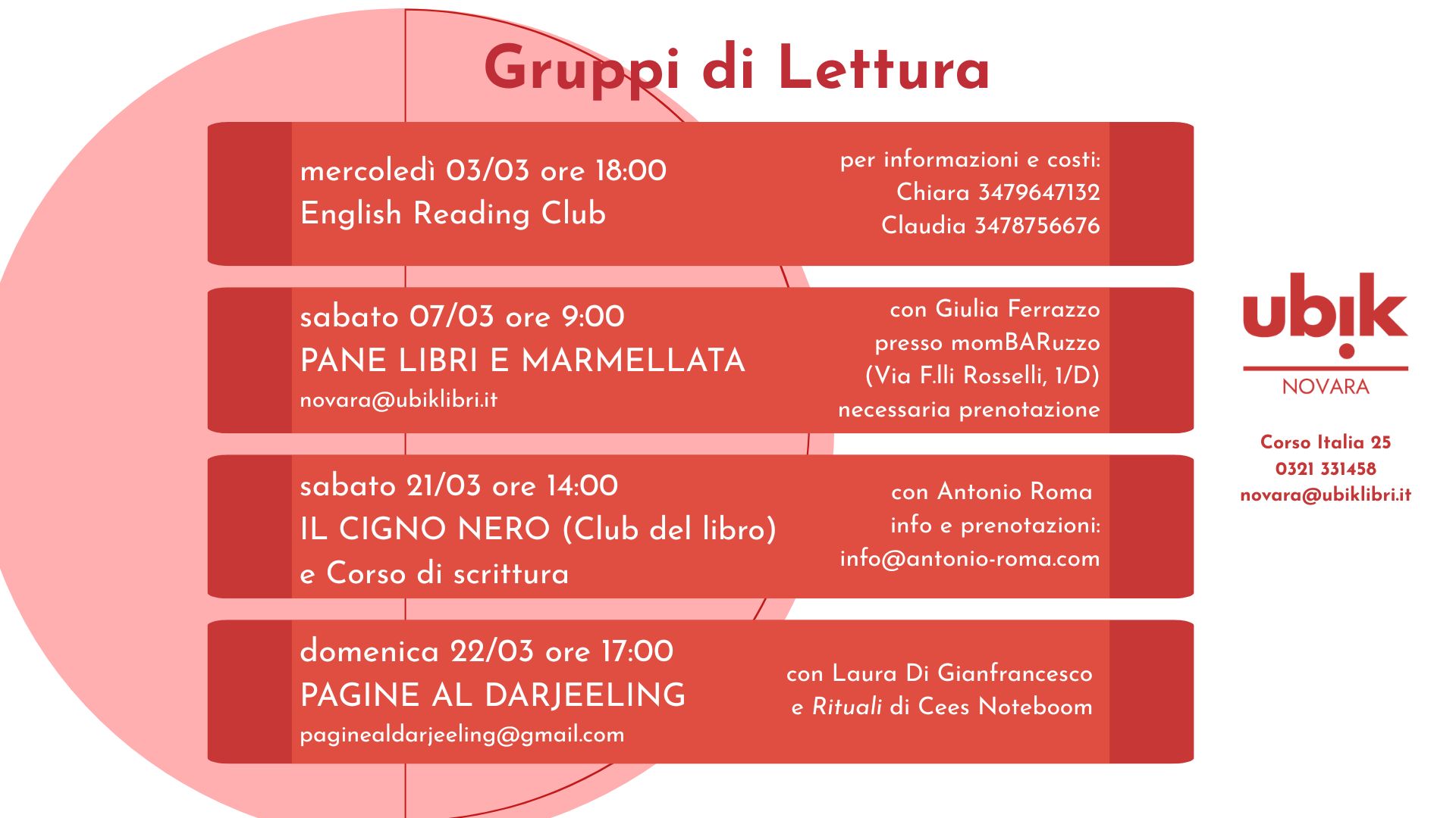 Informazioni: email: novara@ubiklibri.it